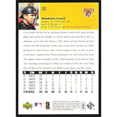 This is a 2006 Upper Deck Humberto Cota baseball card. The card is #753 and pictures show condition.