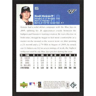 This is a 2006 Upper Deck Scott Downs baseball card. The card is #855 and pictures show condition.
