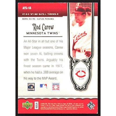 This is a 2006 Upper Deck All-Time Legends Rod Carew baseball card. The card is #ATL-15 and pictures show condition.