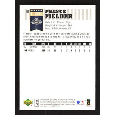 This is a 2006 Upper Deck First Pitch Prince Fielder baseball card. The card is #109 and pictures show condition.