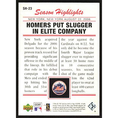 This is a 2006 Upper Deck Season Highlights Carlos Delgado baseball card. The card is #SH-23 and pictures show condition.
