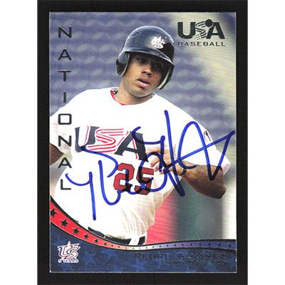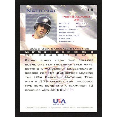 This is a 2006 USA Baseball Pedro Alvarez autographed baseball card. This card has been signed, in blue, by Pedro Alvarez, and is guaranteed authentic by Ballcardz.com. The card is #15 and pictures show condition.