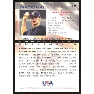 This is a 2006 USA Baseball Jake Arrieta baseball card. The card is #18 and pictures show condition.