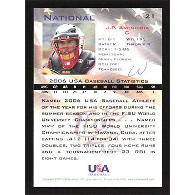 This is a 2006 USA Baseball J.P. Arencibia autographed baseball card. This card has been signed, in blue, by J.P. Arencibia, and is guaranteed authentic by Ballcardz.com. The card is #21 and pictures show condition.