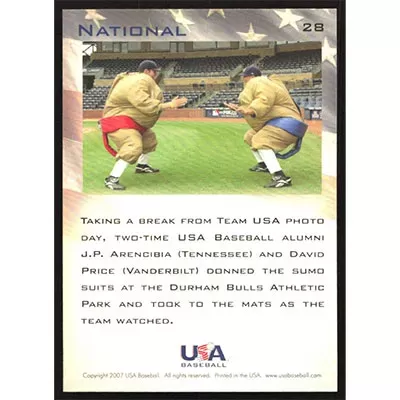 This is a 2006 USA Baseball J.P. Arencibia/David Price Behind the Image baseball card. The card is #28 and pictures show condition.