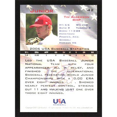 This is a 2006 USA Baseball Tim Alderson autographed baseball card. This card has been signed, in blue, by Tim Alderson, and is guaranteed authentic by Ballcardz.com. The card is #42 and pictures show condition.