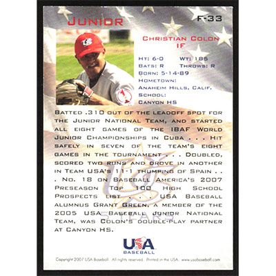 This is a 2006 USA Baseball Foil Christian Colon autographed baseball card. This card has been signed, in blue, by Christian Colon, and is guaranteed authentic by Ballcardz.com. The card is #F-33 and pictures show condition.