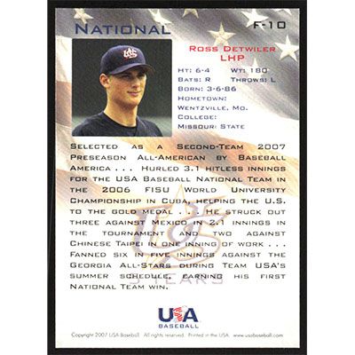 This is a 2006 USA Baseball Gold Foil Ross Detwiler autographed baseball card. This card has been signed, in blue, by Ross Detwiler, and is guaranteed authentic by Ballcardz.com. The card is #F-10 and pictures show condition.
