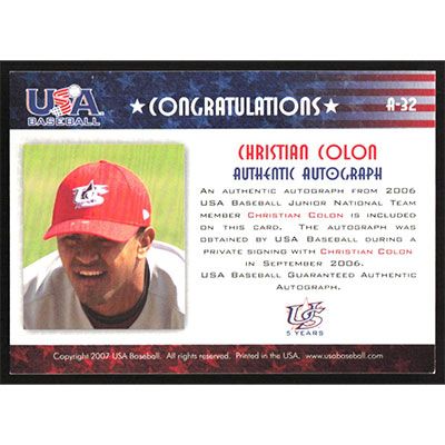 This is a 2006 USA Baseball Signatures Blue Christian Colon autographed baseball card. This card has been signed, in blue, by Christian Colon, and is certified authentic by USA Baseball. The card is #A-32 and pictures show condition. This card is limited; #'d 104/275.
