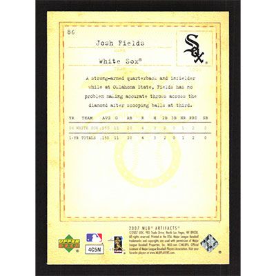 This is a 2007 Artifacts Josh Fields baseball card. The card is #86 and pictures show condition.
