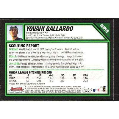 This is a 2007 Bowman Chrome Draft Yovani Gallardo baseball card. The card is #BDP53 and pictures show condition. Team(s): Milwaukee Brewers Rookie Card (RC)