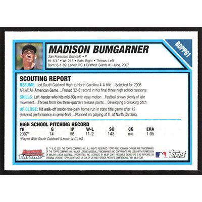 This is a 2007 Bowman Chrome Draft Picks Madison Bumgarner baseball card. The card is #BDPP61 and pictures show condition.