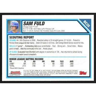 This is a 2007 Bowman Chrome Prospects Sam Fuld baseball card. The card is #BC35 and pictures show condition.