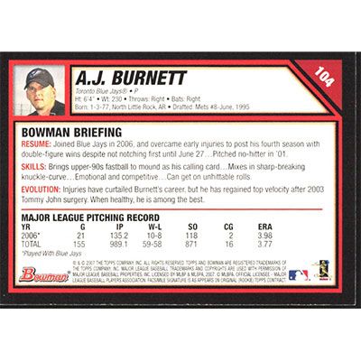This is a 2007 Bowman Gold A.J. Burnett baseball card. The card is #104 and pictures show condition.