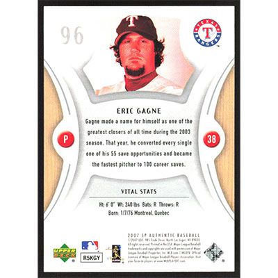 This is a 2007 SP Authentic Eric Gagne baseball card. The card is #96 and pictures show condition.