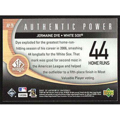 This is a 2007 SP Authentic Authentic Power Jermaine Dye baseball card. The card is #AP-26 and pictures show condition.