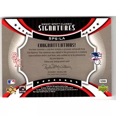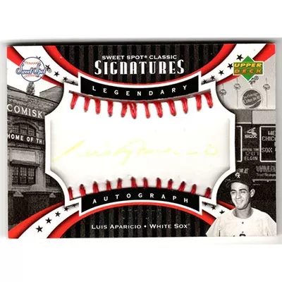 This is a 2007 Sweet Spot Classic Signatures Red Stitch Gold Ink Luis Aparicio autographed baseball card. This card has been signed, in gold, by Luis Aparicio, and is certified authentic by Upper Deck. The card is #SPS-LA and pictures show condition. The ink has faded, and thus is reflected in the price. This card is limited; #'d 067/175.