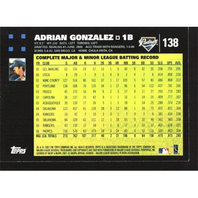 This is a 2007 Topps Adrian Gonzalez baseball card. The card is #138 and pictures show condition.