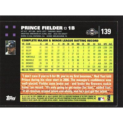 This is a 2007 Topps Prince Fielder baseball card. The card is #139 and pictures show condition.