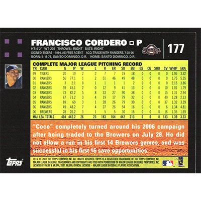 This is a 2007 Topps Francisco Cordero baseball card. The card is #177 and pictures show condition.