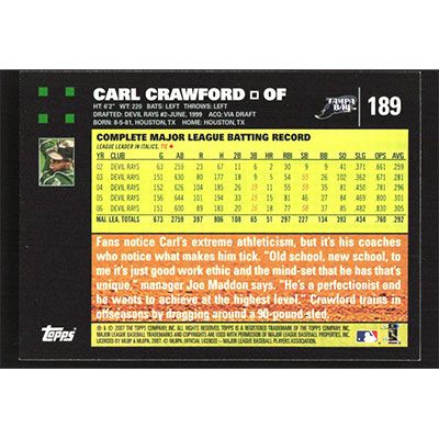 This is a 2007 Topps Carl Crawford baseball card. The card is #189 and pictures show condition.