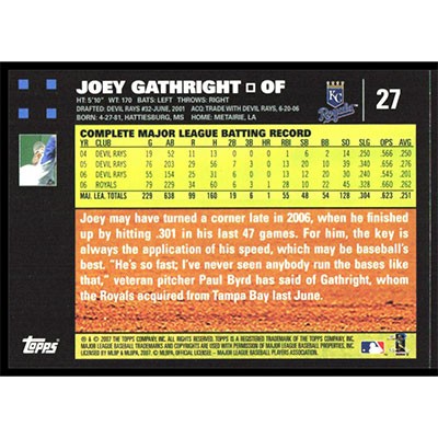 This is a 2007 Topps Joey Gathright baseball card. The card is #27 and pictures show condition.