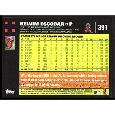 This is a 2007 Topps Kelvim Escobar baseball card. The card is #391 and pictures show condition.