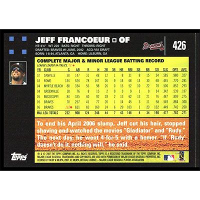 This is a 2007 Topps Jeff Francoeur baseball card. The card is #426 and pictures show condition.