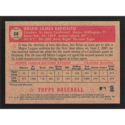 This is a 2007 Topps '52 Brian Esposito baseball card. The card is #58 and pictures show condition.