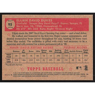 This is a 2007 Topps '52 Elijah Dukes baseball card. The card is #95 and pictures show condition.