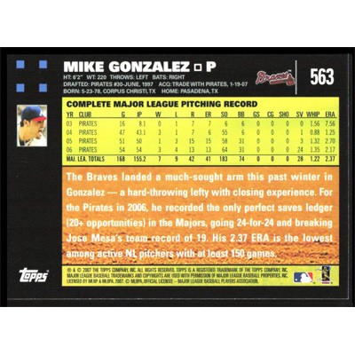 This is a 2007 Topps Mike Gonzalez baseball card. The card is #563 and pictures show condition.