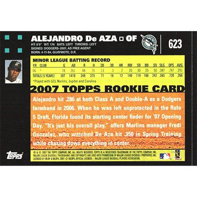 This is a 2007 Topps Alejandro De Aza baseball card. The card is #623 and pictures show condition.