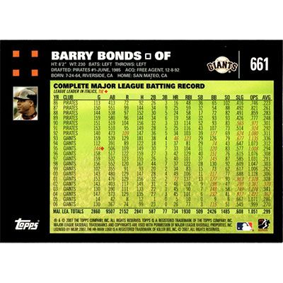 This is a 2007 Topps Barry Bonds baseball card. The card is #661 and pictures show condition.