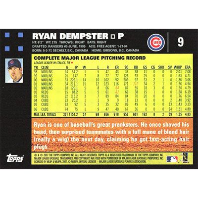 This is a 2007 Topps Ryan Dempster baseball card. The card is #9 and pictures show condition.
