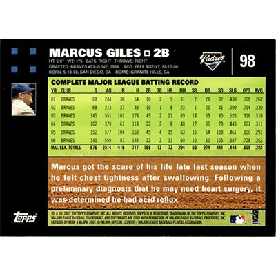This is a 2007 Topps Marcus Giles baseball card. The card is #98 and pictures show condition.