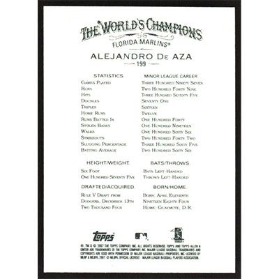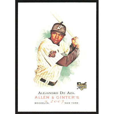 This is a 2007 Topps Allen & Ginter Alejandro De Aza baseball card. The card is #199 and pictures show condition. Team(s): Florida Marlins Rookie Card (RC)