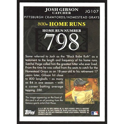 This is a 2007 Topps Gibson Home Run History Josh Gibson baseball card. The card is #JG107 and pictures show condition. Team(s): Pittsburgh Crawfords/Homestead Grays