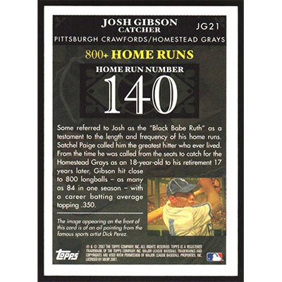 This is a 2007 Topps Gibson Home Run History Josh Gibson baseball card. The card is #JG21 and pictures show condition. Team(s): Pittsburgh Crawfords/Homestead Grays