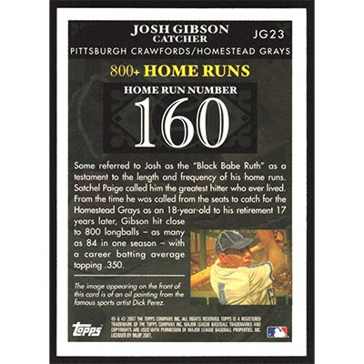 This is a 2007 Topps Gibson Home Run History Josh Gibson baseball card. The card is #JG23 and pictures show condition. Team(s): Pittsburgh Crawfords/Homestead Grays