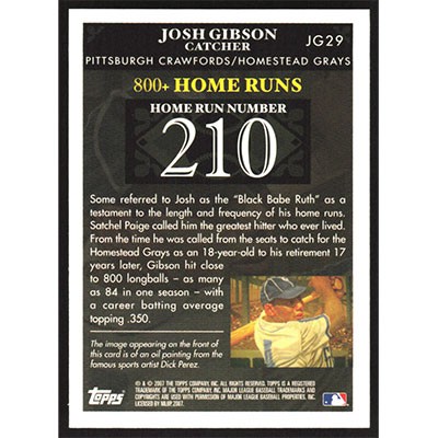 This is a 2007 Topps Gibson Home Run History Josh Gibson baseball card. The card is #JG29 and pictures show condition. Team(s): Pittsburgh Crawfords/Homestead Grays