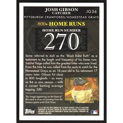 This is a 2007 Topps Gibson Home Run History Josh Gibson baseball card. The card is #JG36 and pictures show condition. Team(s): Pittsburgh Crawfords/Homestead Grays