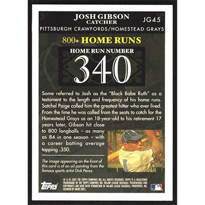This is a 2007 Topps Gibson Home Run History Josh Gibson baseball card. The card is #JG45 and pictures show condition. Team(s): Pittsburgh Crawfords/Homestead Grays