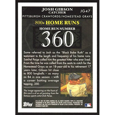 This is a 2007 Topps Gibson Home Run History Josh Gibson baseball card. The card is #JG47 and pictures show condition. Team(s): Pittsburgh Crawfords/Homestead Grays