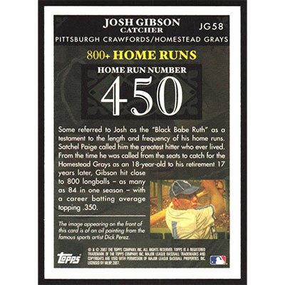 This is a 2007 Topps Gibson Home Run History Josh Gibson baseball card. The card is #JG58 and pictures show condition. Team(s): Pittsburgh Crawfords/Homestead Grays