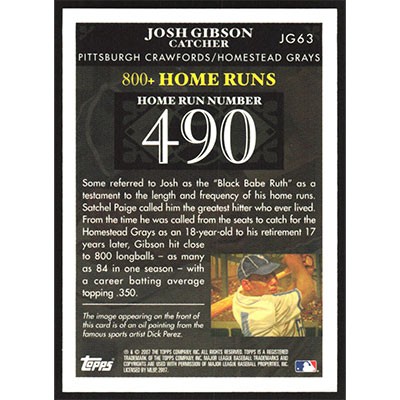 This is a 2007 Topps Gibson Home Run History Josh Gibson baseball card. The card is #JG63 and pictures show condition. Team(s): Pittsburgh Crawfords/Homestead Grays