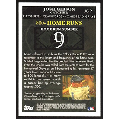 This is a 2007 Topps Gibson Home Run History Josh Gibson baseball card. The card is #JG9 and pictures show condition. Team(s): Pittsburgh Crawfords/Homestead Grays