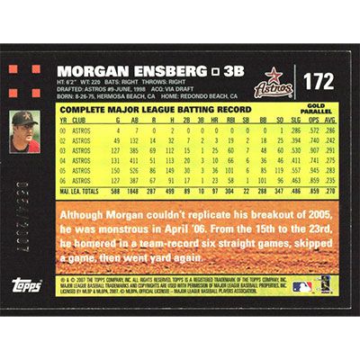 This is a 2007 Topps Gold Morgan Ensberg baseball card. The card is #172 and pictures show condition. This card is limited; #'d 0554/2007. Team(s): Houston Astros