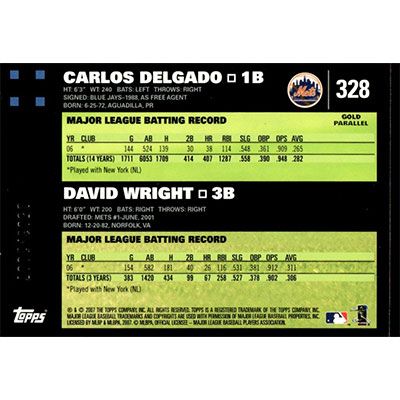 This is a 2007 Topps Gold Carlos Delgado and David Wright Classic Combo baseball card. The card is #328 and pictures show condition. This card is limited; #'d 0503/2007.