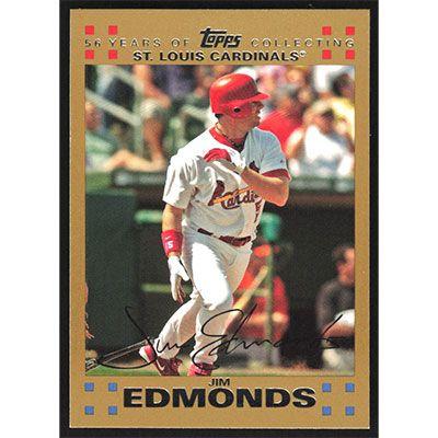This is a 2007 Topps Gold Jim Edmonds baseball card. The card is #39 and pictures show condition. This card is limited; #'d 0995/2007. Team(s): St. Louis Cardinals