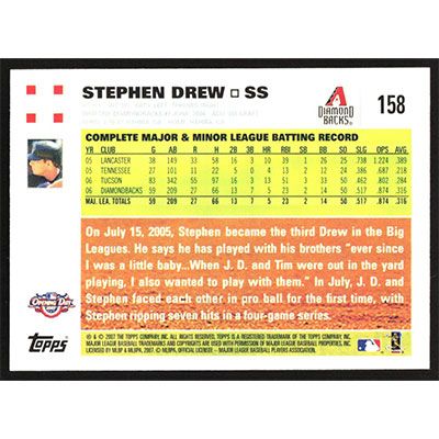 This is a 2007 Topps Opening Day Stephen Drew baseball card. The card is #158 and pictures show condition.